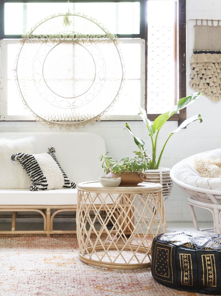 The diamond style rattan work on this piece has us swooning! This table is light and versatile and would work as both a side or coffee table or plant stand in your home.