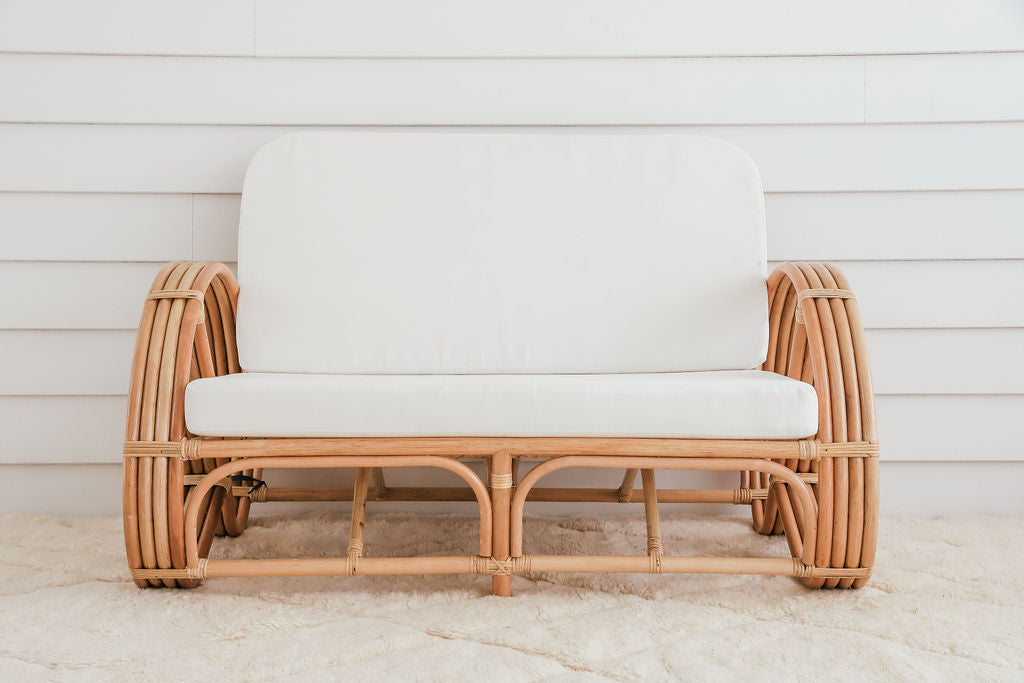 We just can't get enough of our retro inspired Pretzel range. Reminiscent of similar styles of the 60's and 70's, this couch is equal parts style and comfort. Super sturdy with four layers of handwoven rattan for the legs, these are sure to stand the test of time.