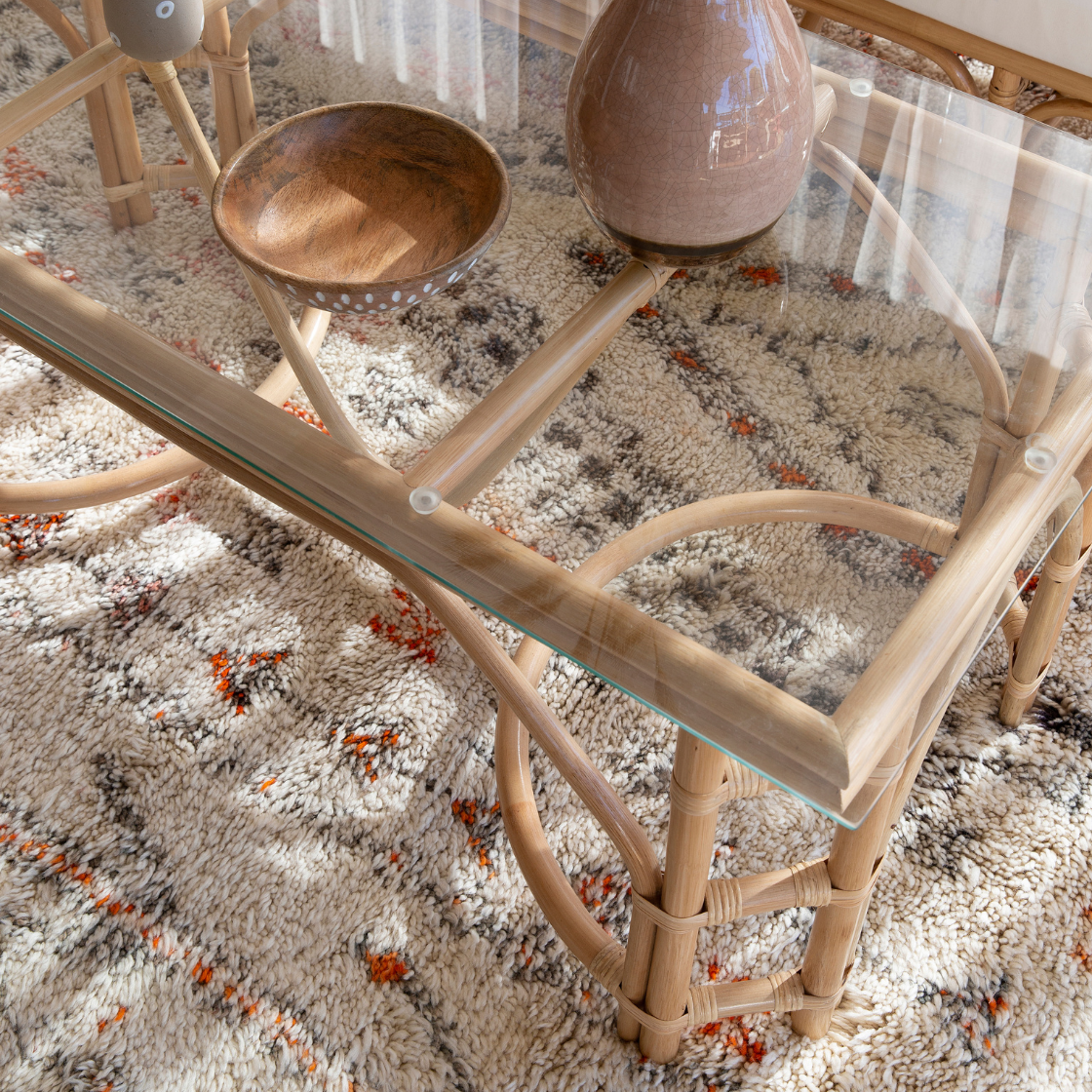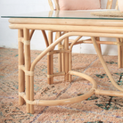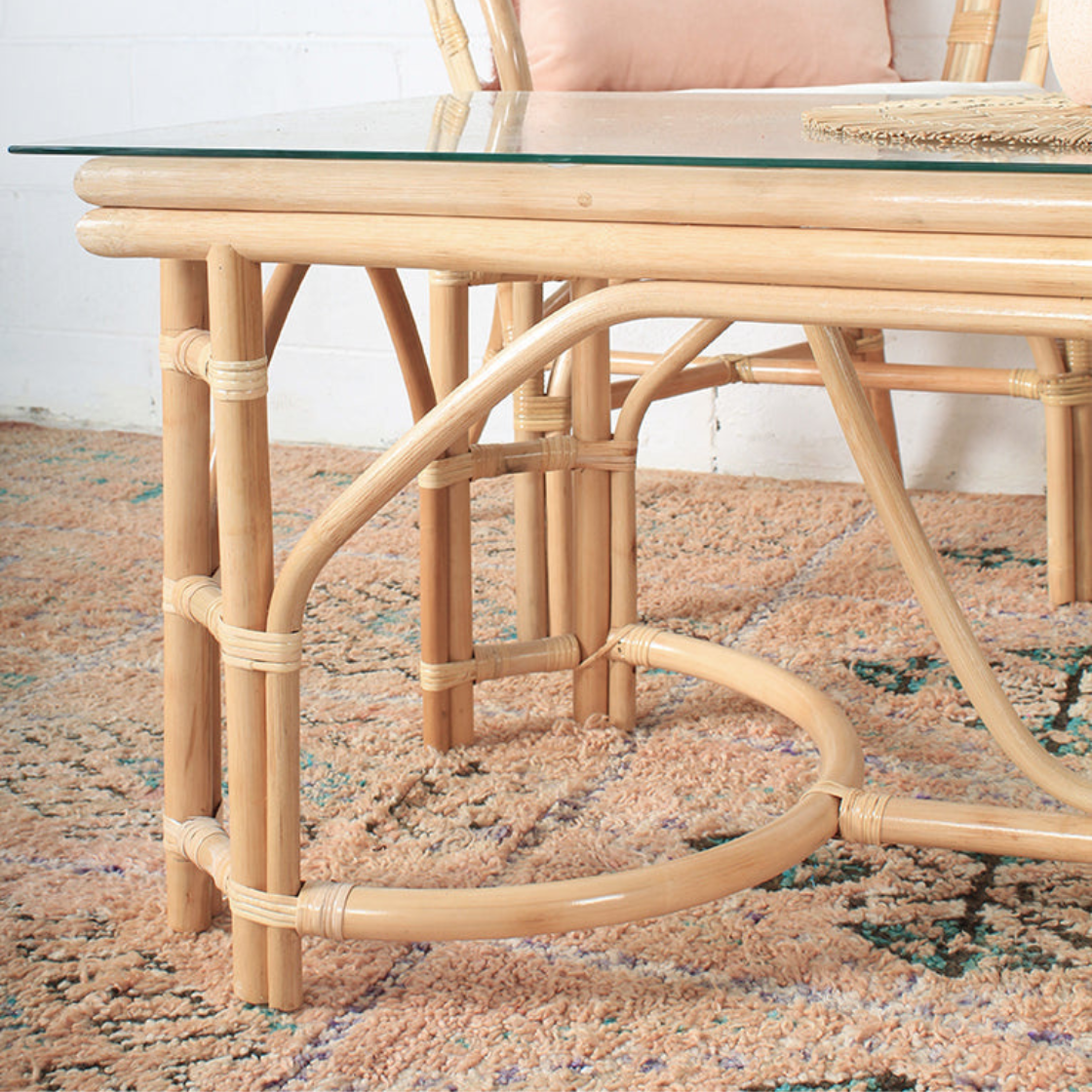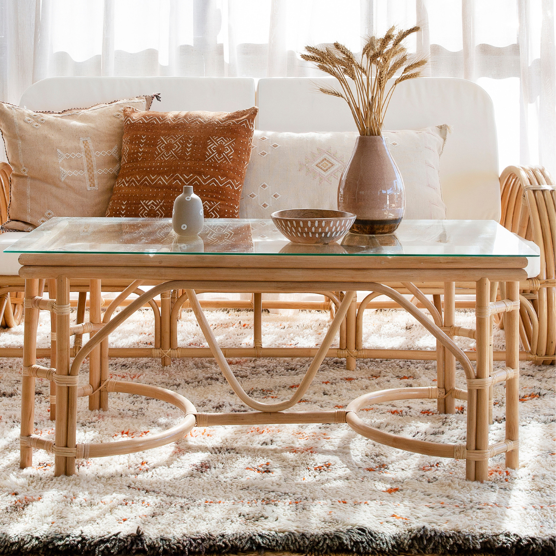 Indulge in the unique design and craftsmanship of our hand made rattan Pretzel coffee table from the pretzel collection. With a sleek glass top, this one-of-a-kind coffee table adds a touch of sophistication to any living space. Elevate your interior decor with this stylish and functional piece!