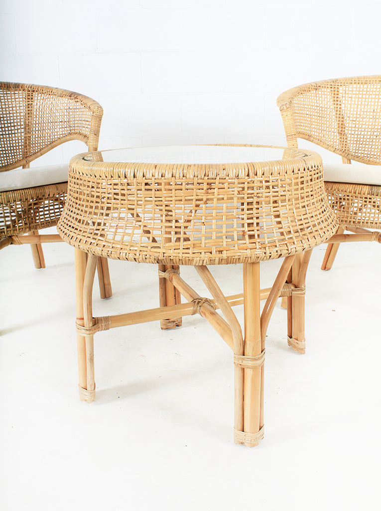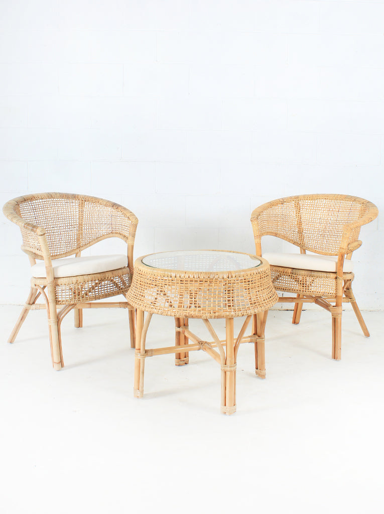 Samadhi is the final stage of meditation where the mind body and spirit equally become still and fully enlightened. This heavenly set will add a feeling of peace and elegance to any home. Intricately hand woven rattan with sturdy foundations are key features which make this three piece set so divine! Glass and white chair cushions included.