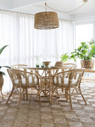With hand crafted curved rattan arches, this piece bring a fun and functional touch to any home. The table includes a glass top.