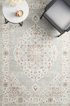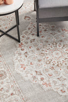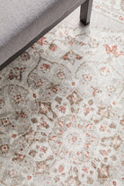 Contrasted against a neutral grey backdrop, Emotion's floral medallion design is beautifully complemented by vibrant pops of colour, with warm beige and dusty rose hues blending harmoniously together.