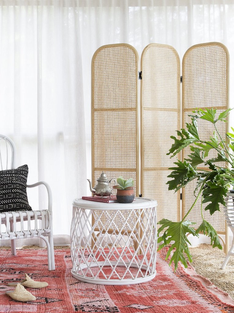 Love this styling? Other products featured: Moroccan Raffia Happy Slides, Veil Screen Divider, Round Moroccan Leather Ottoman, Beni Mguild Rugs