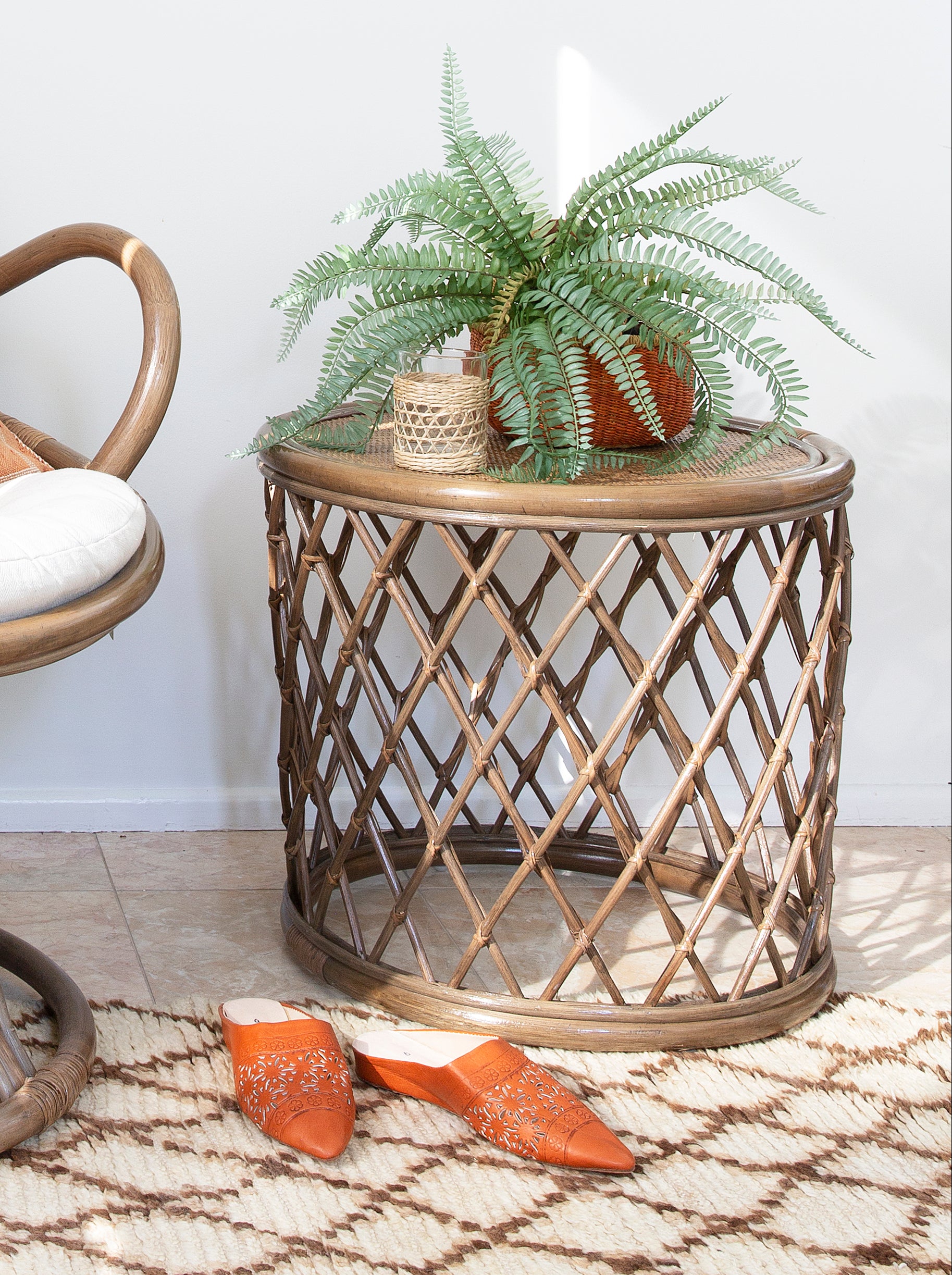 The diamond style rattan work on this piece has us swooning! This table is light and versatile and would work as both a side or coffee table or plant stand in your home.