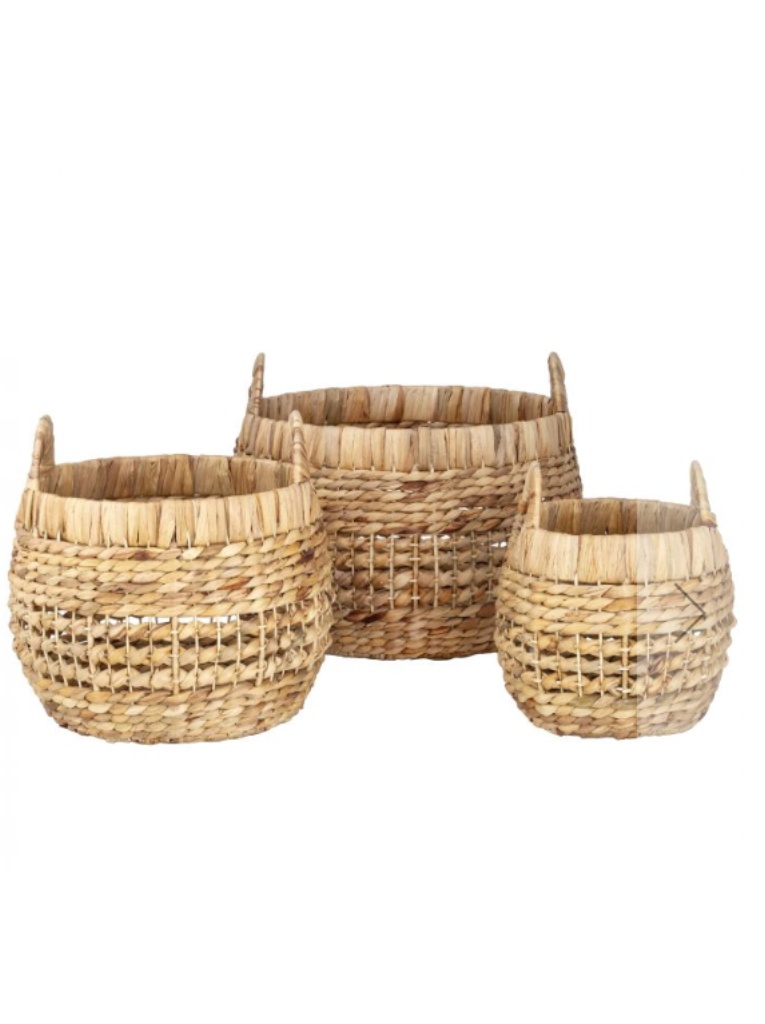 Hand woven from water hyacinth and metal, they offer a rustic appearance. They display a mix of open and tight weaves alongside charming handles.
