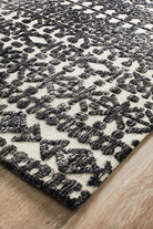 Levi Yasmin range from the Levi collection delivers a striking and magical touch to any room or home setting. It presents a series of layered geometrical and nomadic figures on alternate arrangement brushed in black tint with off-white contrast underlying context. This impressive 15 mm table tufted rug in India features a thick bodied pile, very comfortable and with mesmerizing style and design bringing elegance and luxury in your home.
