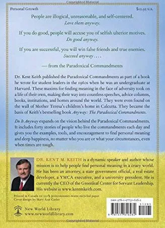 Missionaries of Charity in Calcutta. Thirty years later, they were reclaimed by Kent and formally published as Anyway: The Paradoxical Commandments , an inspirational guide for living.Now, Kent shares new stories of following these simple, sensible truths. In Do It Anyway , Kent provides specific tools, exercises, and suggestions that the reader can use for personal introspection or group discussion. As Keith has travelled the world talking with people about the Paradoxical Commandments , he has been struck by the fact that almost everyone agrees that they should live the paradoxical life . The question is: how do you do it? This book is his answer. It gives people the examples, the tools, and the encouragement to live the paradoxical life and find personal meaning and deep happiness, no matter who they are, and no matter what their past or present conditions may be.The book includes 40 stories from people he has personally known who live the Paradoxical Commandments each day. They include a school teacher, a housing developer, a retired Navy captain, a YMCA leader, a jeweller, an occupational therapist, the CEO of a non-profit organization, a college professor, a pineapple plantation worker, an Army sergeant, a nurse, and a financial adviser.
