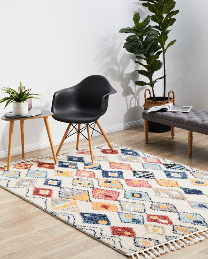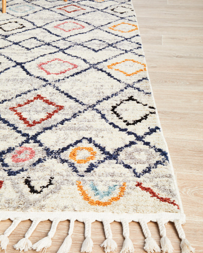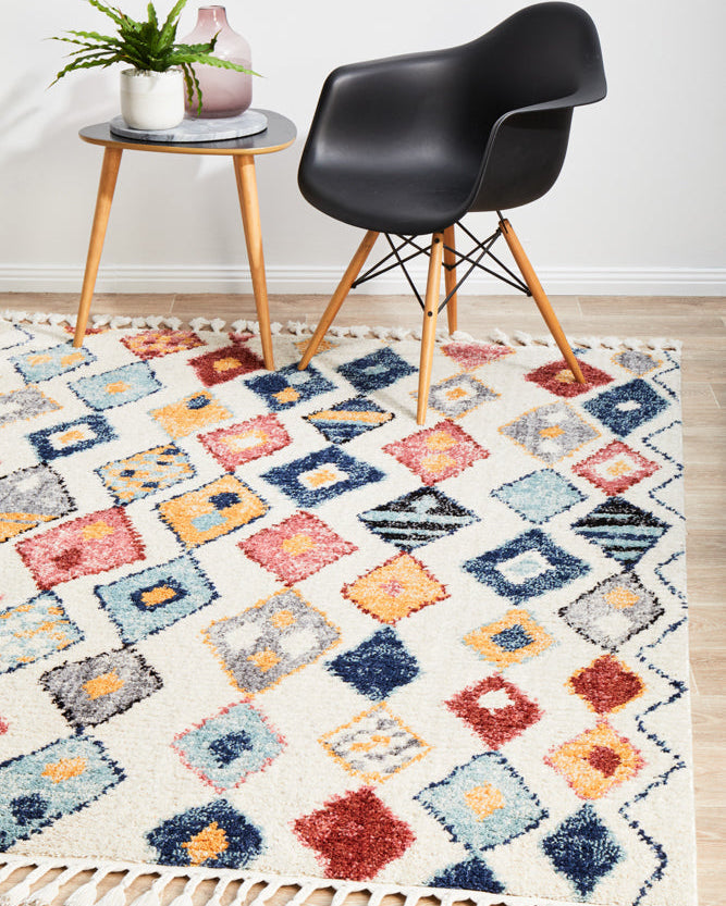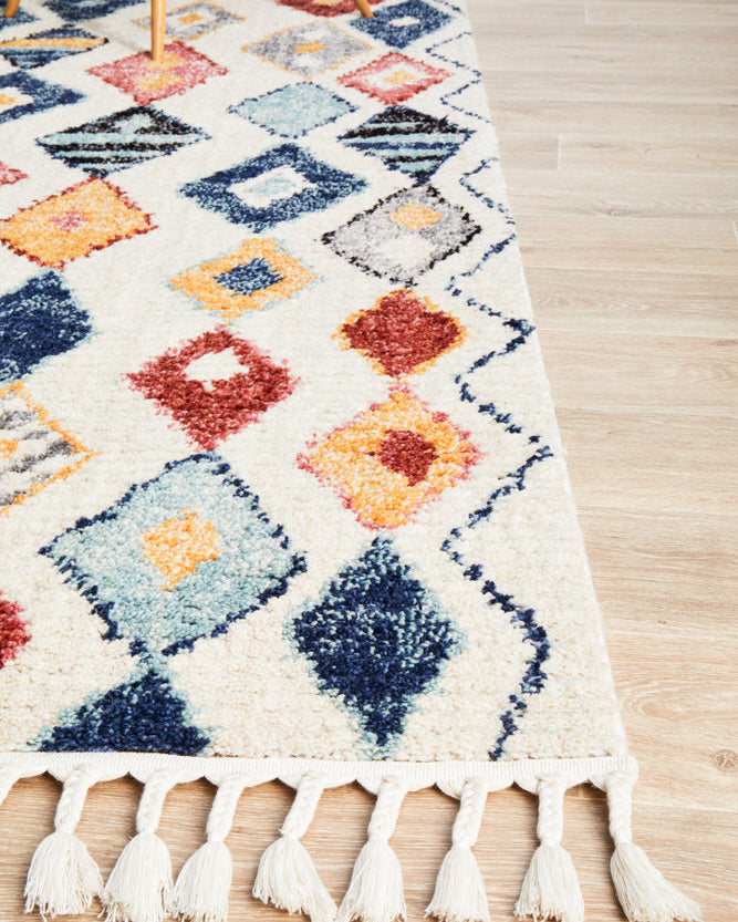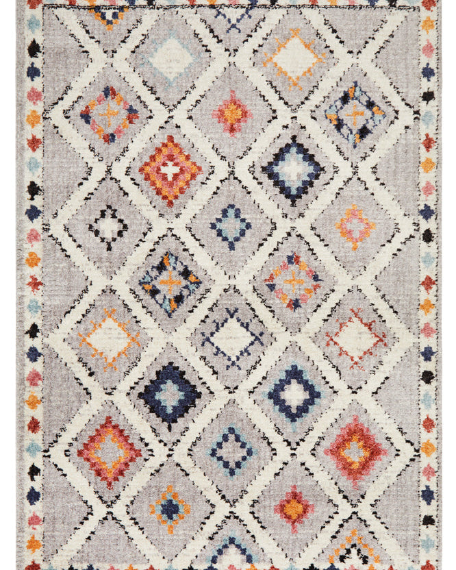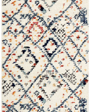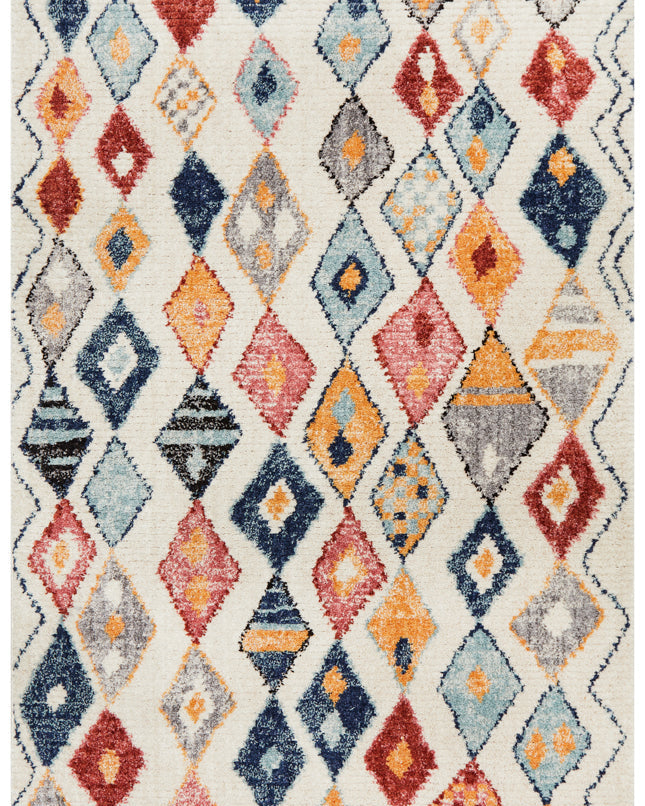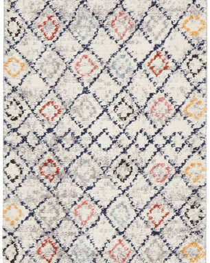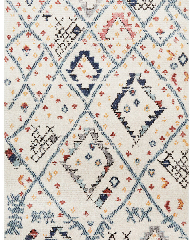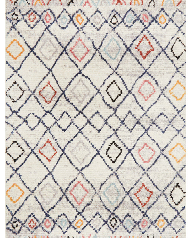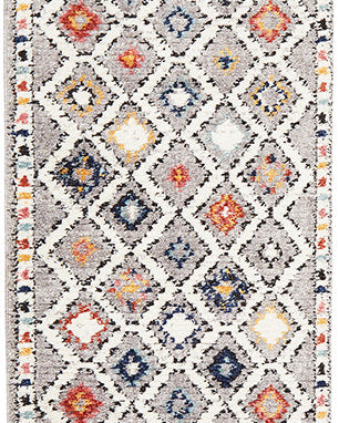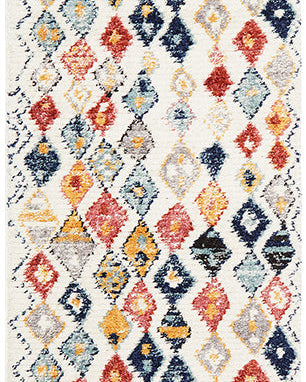 Indulge yourself in this excellent Moroccan berber inspired collection. Marrakesh strides deeply with bold multicolored palette of diamond patterns duly plotted with mixed patterns giving a truly amazing tribal decor statement. This collections material is expertly woven using polypropylene which highlights a soft 20mm pile, a total eye catcher and everyone would love to have this collection.