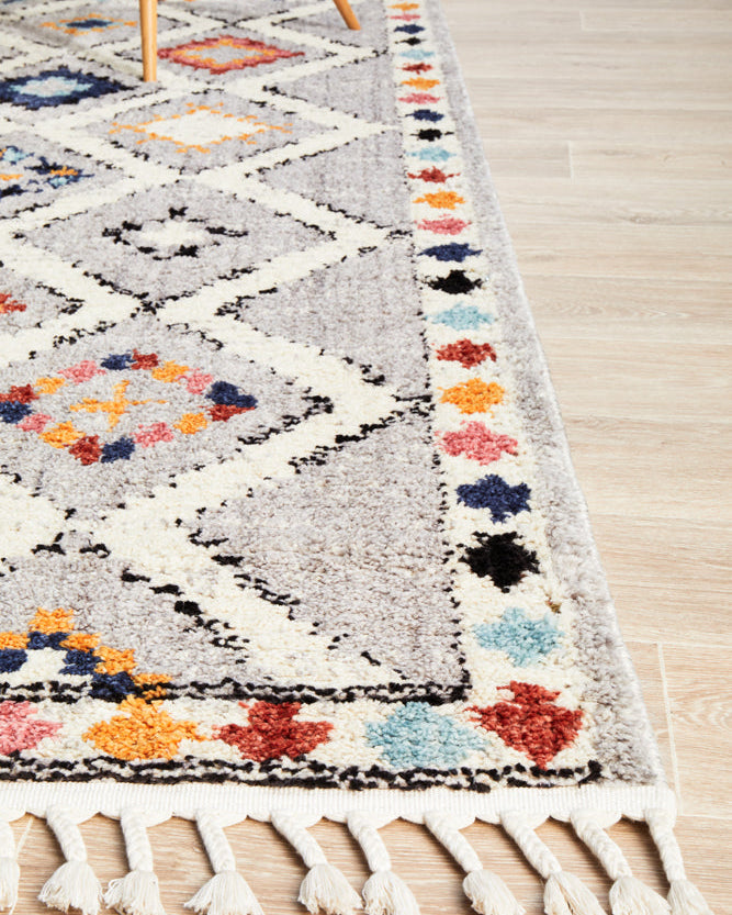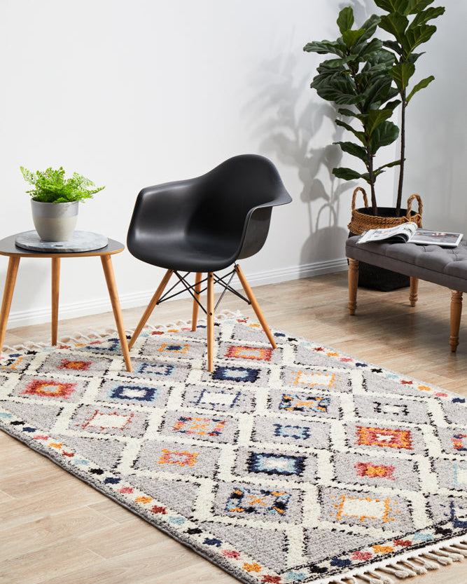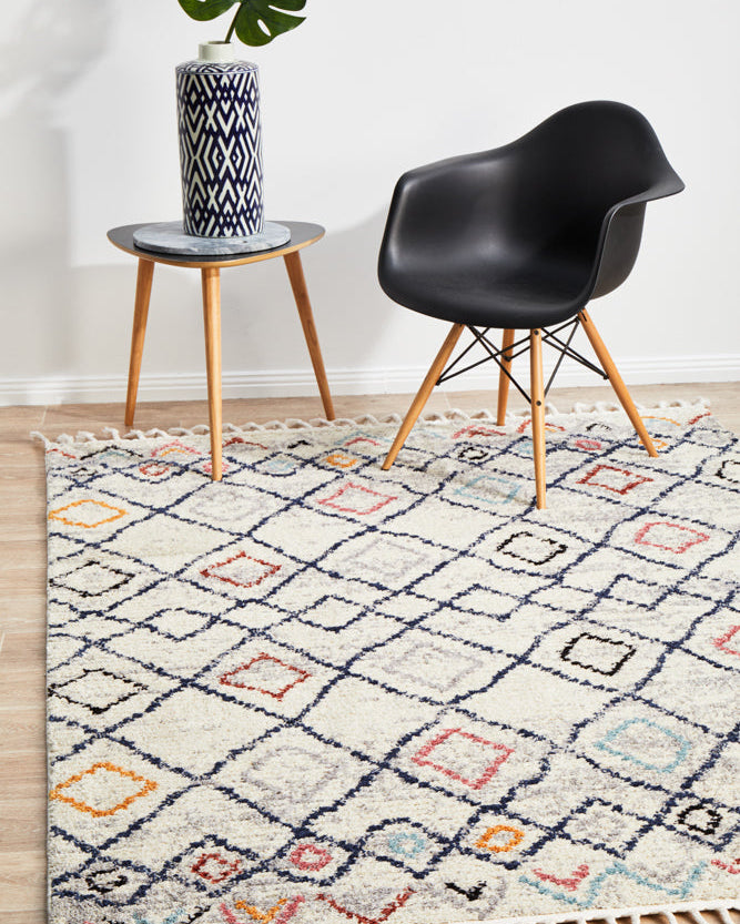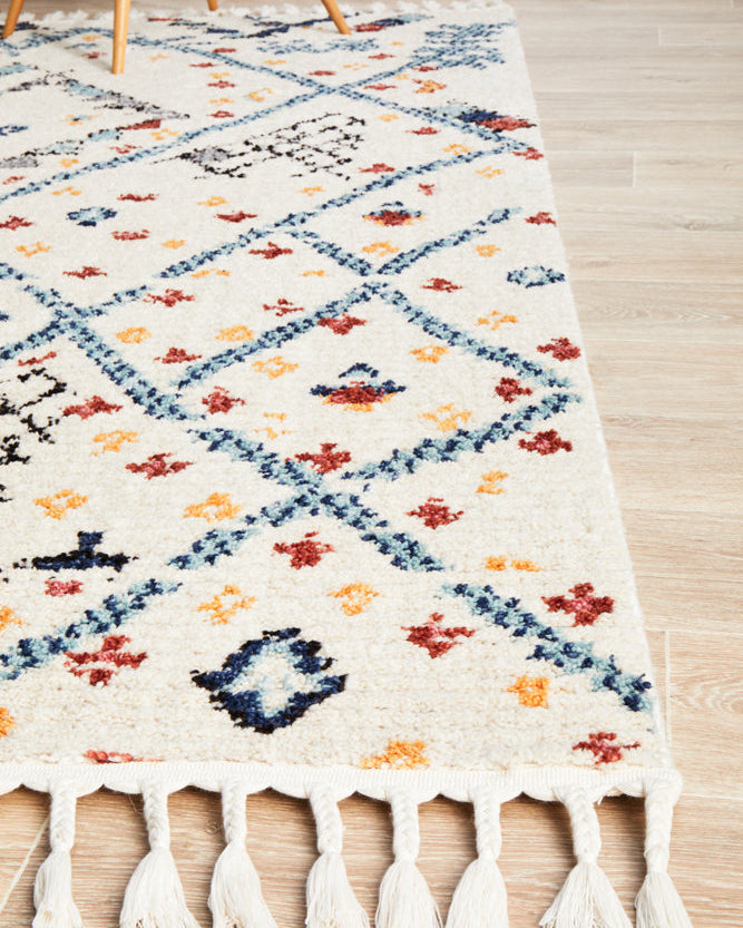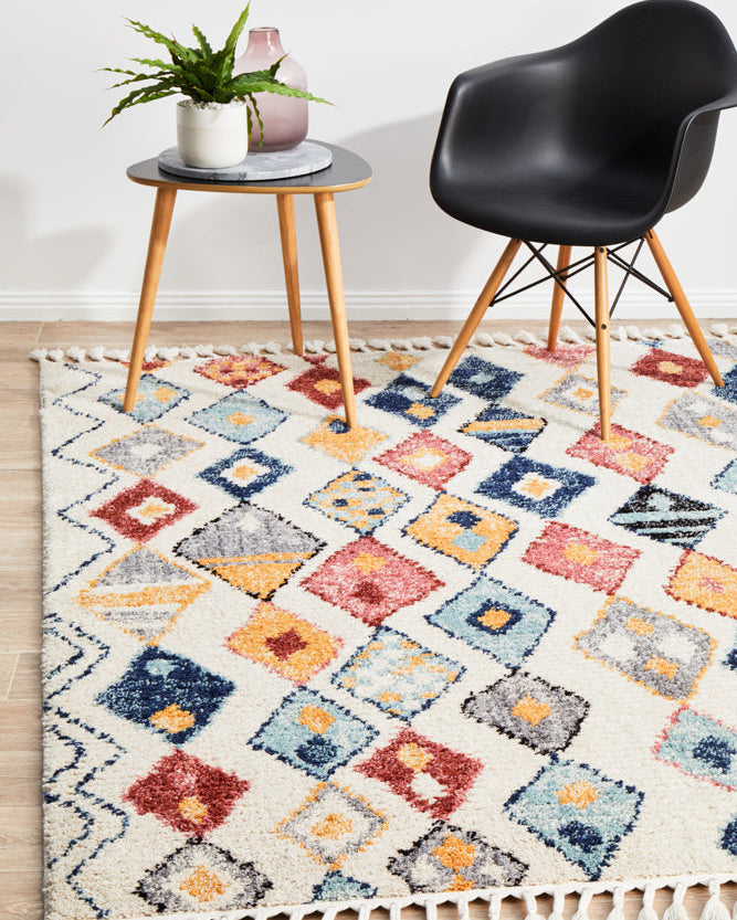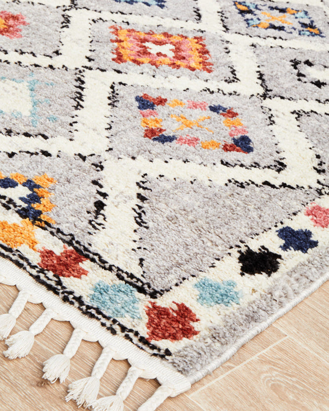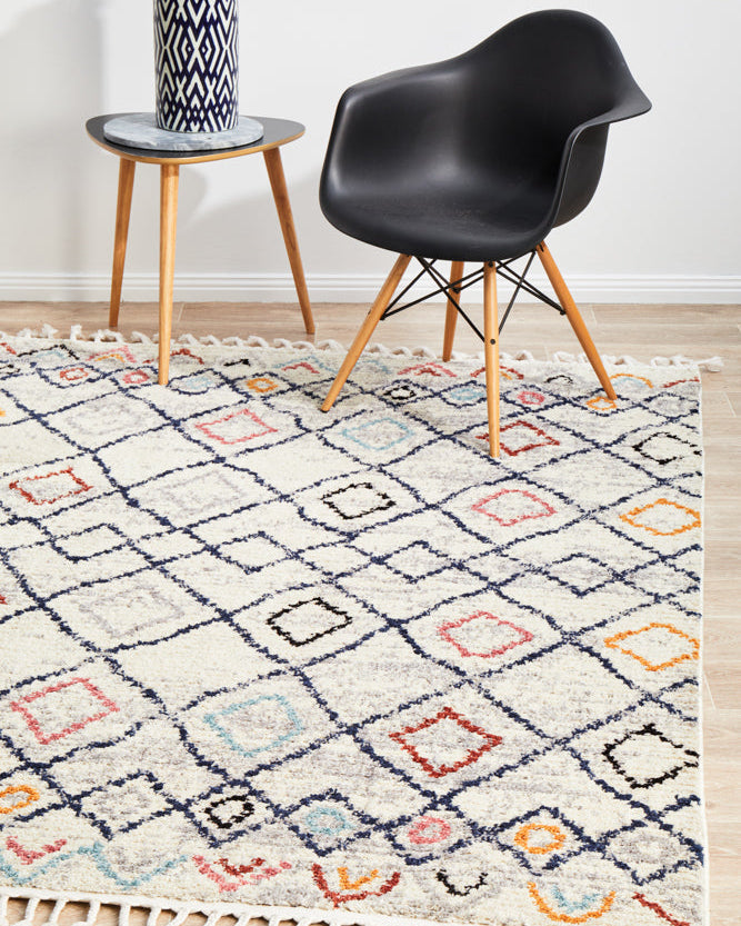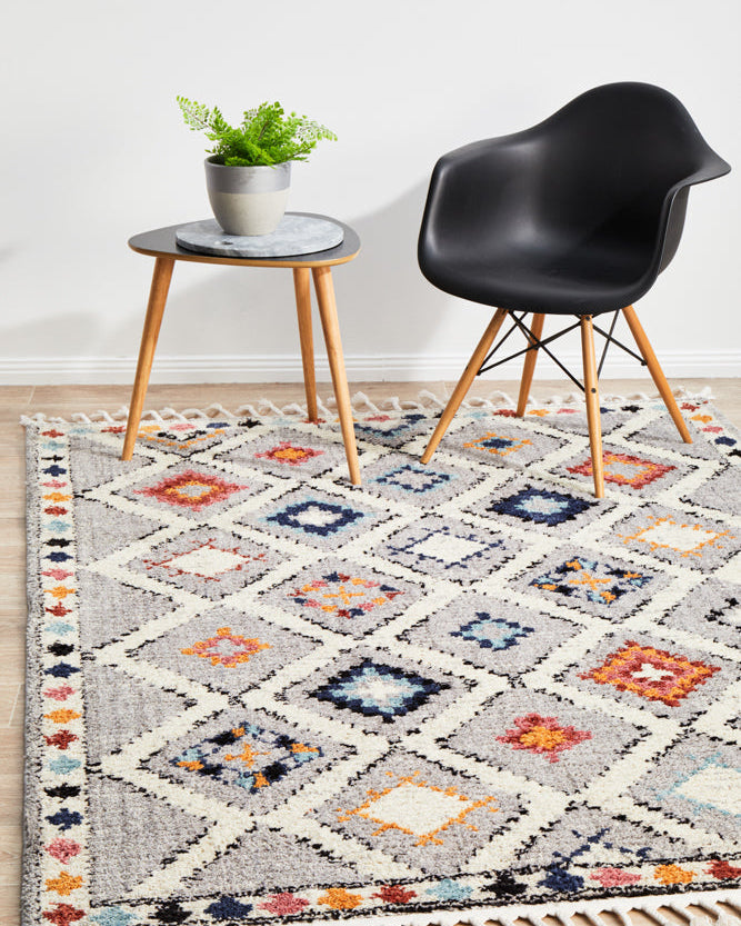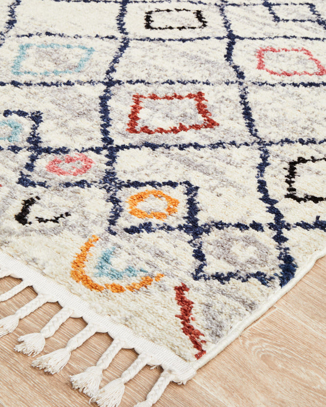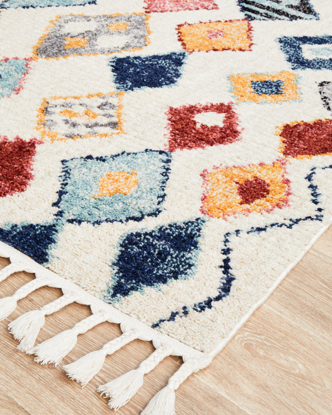 Indulge yourself in this excellent Moroccan berber inspired collection. Marrakesh strides deeply with bold multicolored palette of diamond patterns duly plotted with mixed patterns giving a truly amazing tribal decor statement. This collections material is expertly woven using polypropylene which highlights a soft 20mm pile, a total eye catcher and everyone would love to have this collection.