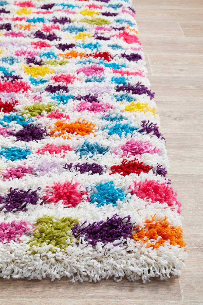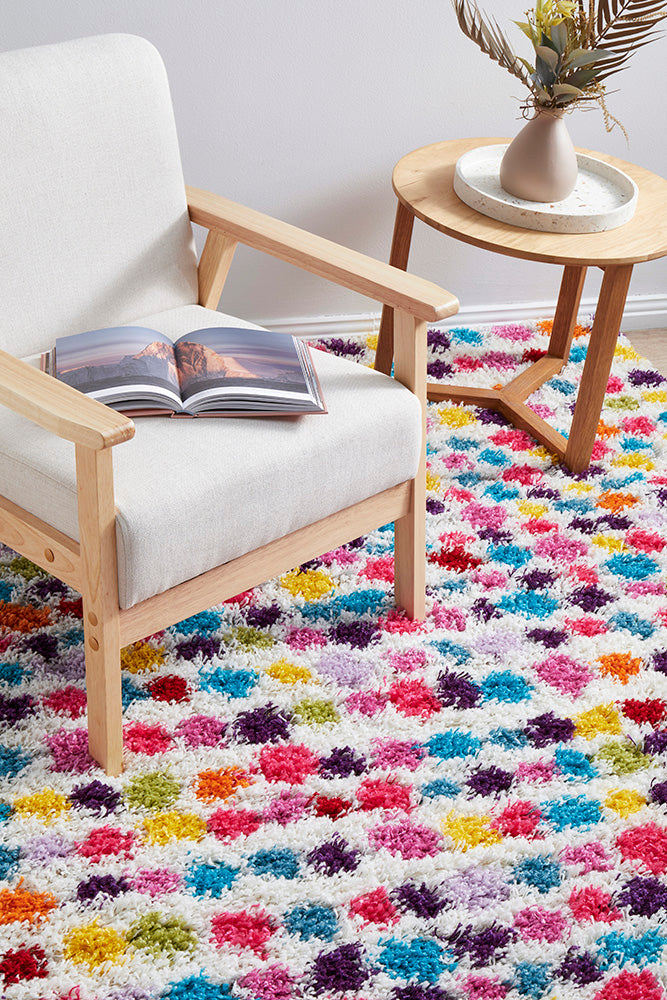 Bursting with personality, Vegas is sure to brighten up your floors with its vibrant playful design. This fabulous low-pile shag style rug showcases a stunning display of multi-coloured dots that make it a great choice for electric interiors and kids playrooms.