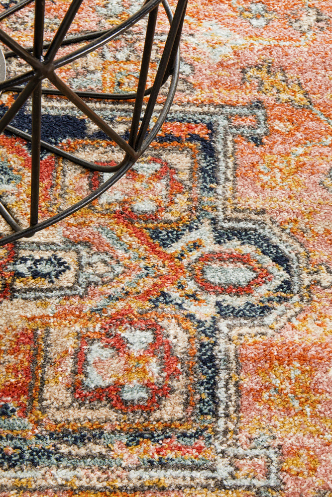 Indulge in this one of a kind rug from the famous Legacy collection. The Legacy Salmon rug highlights a fusion of Aztec patterns and contemporary scheme. With bright orange, red and dark tone, the piles chic further amplifies with ornamental figure surrounds and ensures durability via serge edges. This faded Persian-inspired design is crafted in Turkey from 100% polypropylene, which is naturally designed to stand up to dirt and debris in the entryway or the occasional spill under the kitchen table.